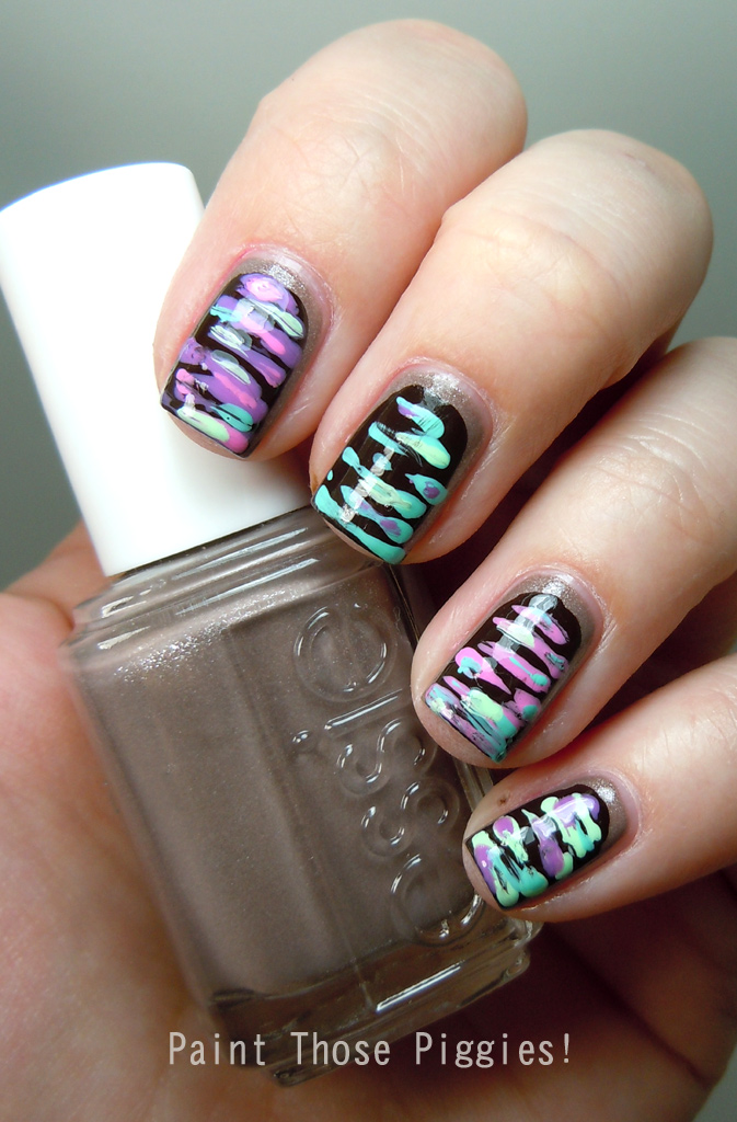 I will start off by saying that I had a different plan for this mani, which is why it started with a ruffian. For the ruffian I used Essie Mochachino topped with Essie Little Brown Dress. I've never attempted a sugar spun mani and I don't think it looks terribly difficult, but I wonder if they are practical to wear. I always wonder if those 3D lines of polish ever dry.....do they? So, to create a kind of sugar spun effect, I took my smallest nail art brush with some bright colors and simply drew lines across my nails. The colors I used were Essie Splash of Grenadine, China Glaze Highlight of My Summer, China Glaze Too Yacht to Handle, and China Glaze Bottoms Up. I started with one color on each nail, and then decided to create a layered effect with some of the colors.